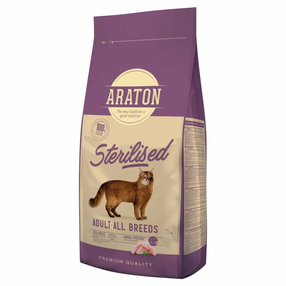 Η Araton Sterilised είναι μία πλήρης και ισορροπημένη ξηρά τροφή, ειδικά σχεδιασμένη για ενήλικες γάτες μετά τη στείρωση ή για γάτες με τάση να παίρνουν βάρος.