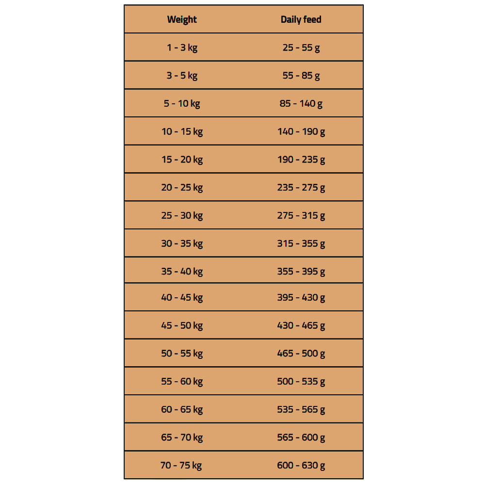 Αναλυτικά συστατικά: Ακατέργαστη πρωτεΐνη 25%, λιπαρά 16%, ακατέργαστη τέφρα 9,5%, ακατέργαστες ίνες 2,5%, ασβέστιο 2,2%, φώσφορος 1,4%, Ωμέγα-3 λιπαρά οξέα 0,53%, Ωμέγα-6 λιπαρά οξέα 3,17%.