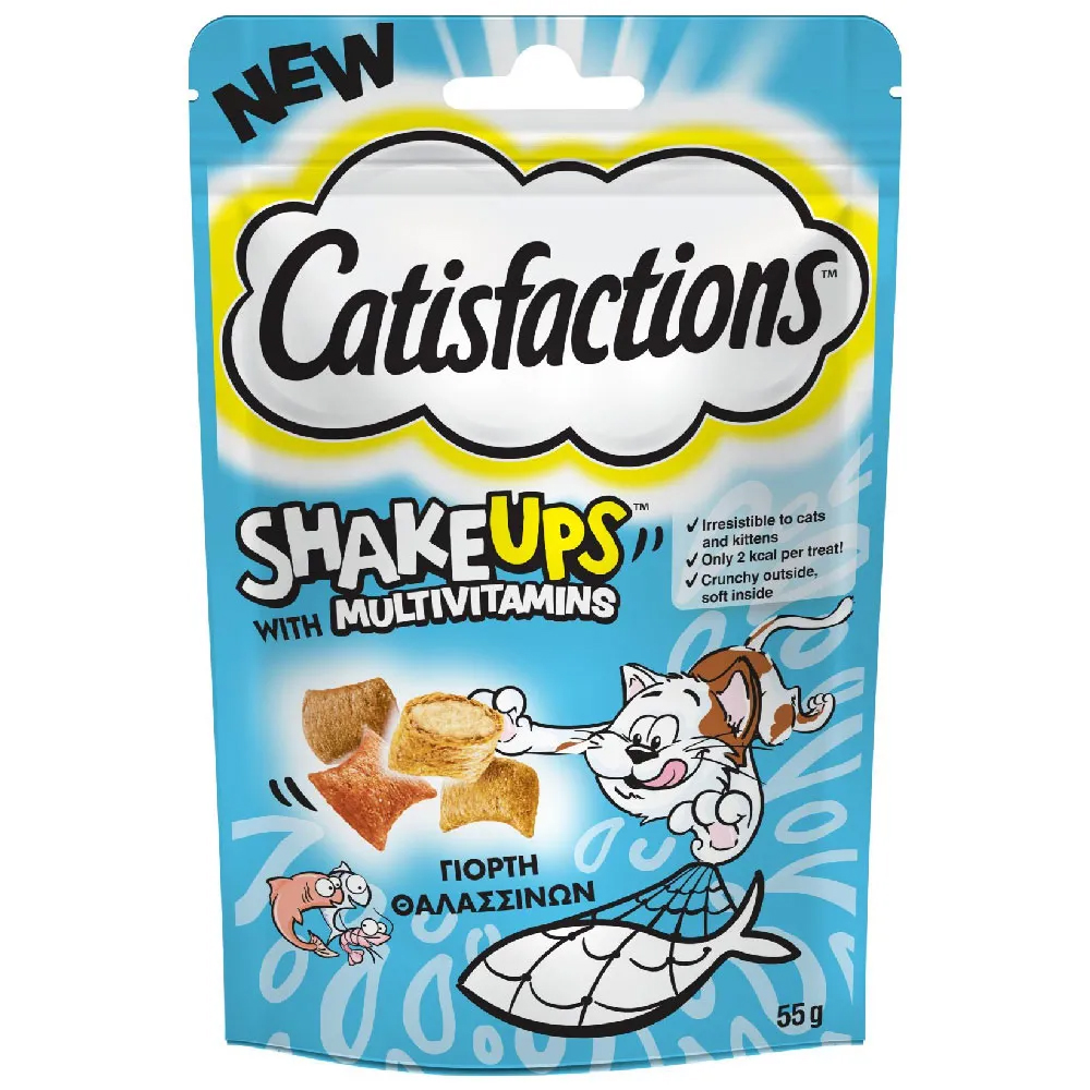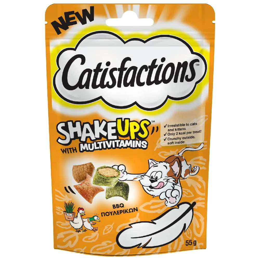 Το Catisfactions Shake Ups είναι ένα σνακ με πολυβιταμίνες, που οι γάτες αγαπούν. Γεμιστή κροκέτα με τραγανό εξωτερικό περίβλημα και τρυφερή γέμιση εσωτερικά. <2kcal / τμχ