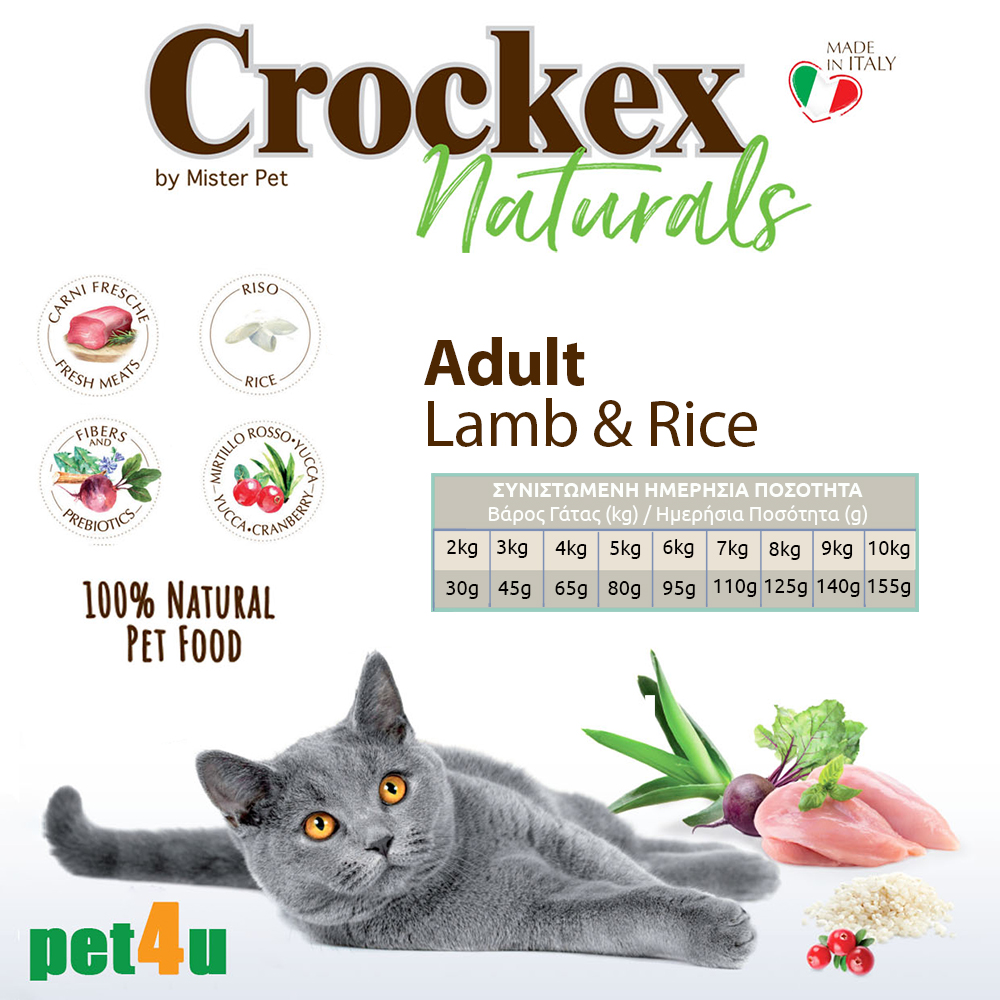 Η Crockex Naturals Adult Lamb & Rice, έχει σχεδιαστεί για να καλύπτει όλες τις διατροφικές ανάγκες που έχουν οι ενήλικες γάτες.