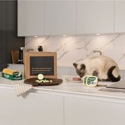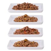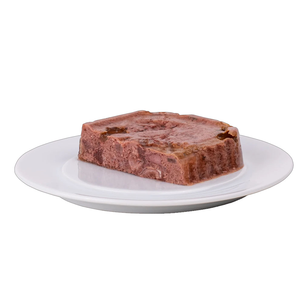 Σύνθεση: Κρέας και ζωικά παράγωγα, Ψάρι και παράγωγα ψαριών (περιέχει 14% ψάρι), Λαχανικά (κολοκυθάκια 4%), Μέταλλα, Έλαια και λίπη, Παράγωγα φυτικής προέλευσης, Διάφορα Σάκχαρα. Θρεπτικά Συστατικά (ανά kg τελικού προϊόντος): Βιταμίνη Ε (3a700) 45 mg, Ταυρίνη (3a370) 96.28 mg, Βιταμίνη Β1 (3a821) 10.32 mg, Βιοτίνη 0.01 mg, Χαλκός (3b405) 0.04 mg, Μαγνήσιο (3b503) 0.55mg, Ψευδάργυρος (3b605) 7.32mg, Μεθειονίνη (3c301) 2406mg, Ιώδιο (3b201) 0.12mg, Βιταμίνη Β6 (3a831) 0.03 mg. Αναλυτικά Συστατικά: Ακατέργαστη πρωτεΐνη 10.0%, Ακατέργαστα Λιπαρά 4.5%, Ακατέργαστη Τέφρα 2.0%, Υγρασία 82.0%, Ακατέργαστες φυτικές ίνες 0.8%, NNE 0.7%, Καθαρή ενέργεια 80.08Kcal / 100gr. Πρόσθετες πληροφορίες: Μεταβολιζόμενη ενέργεια: 81 kcal/100g, Αναλογία θερμίδων πρωτεΐνης: 123g/mCal. Ασβέστιο: 0.33%*, Φώσφορος: 0.23%*, Ca/P: 1.4%, Ωμέγα 6: 0,80%*, Ωμέγα 3: 0,26%*. *Μέσος όρος για πολλές αναλύσεις που πραγματοποιήθηκαν το 2022.