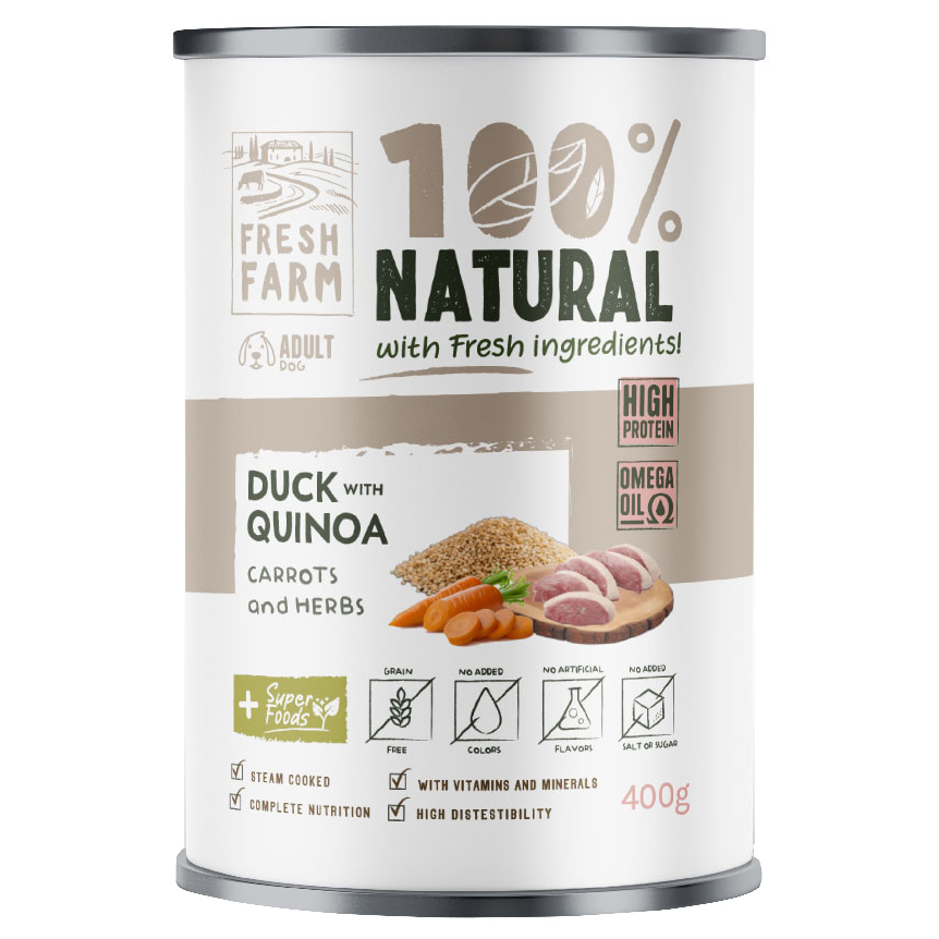 ΠΑΠΙΑ, ΚΙΝΟΑ, ΚΑΡΟΤΟ & ΒΟΤΑΝΑ: Σύσταση: πάπια 30%, κοτόπουλο 25%, κινόα 8%, καρότα 8%, μήλα 2%, βιταμίνες και μέταλλα, μείγμα βοτάνων, έλαιο σολομού, μαϊντανός, λιναρόσπορος, φύκη. Πρόσθετα/kg: βιταμίνη D3 (E671) 200 IU, βιταμίνη E (3a370) 150mg, ψευδάργυρος (3b610) 15mg, μαγγάνιο (3b510) 3mg, ανθρακικό ασβέστιο 2mg. Αναλυτικά συστατικά: ακατέργαστη πρωτεΐνη 8%, έλαια και λίπη 7%, ακατέργαστη τέφρα 2,2%, υγρασία 75,0%, ακατέργαστες ίνες 0,7%, ασβέστιο 0,3%, φώσφορος 0,2%, νάτριο 0,4%.