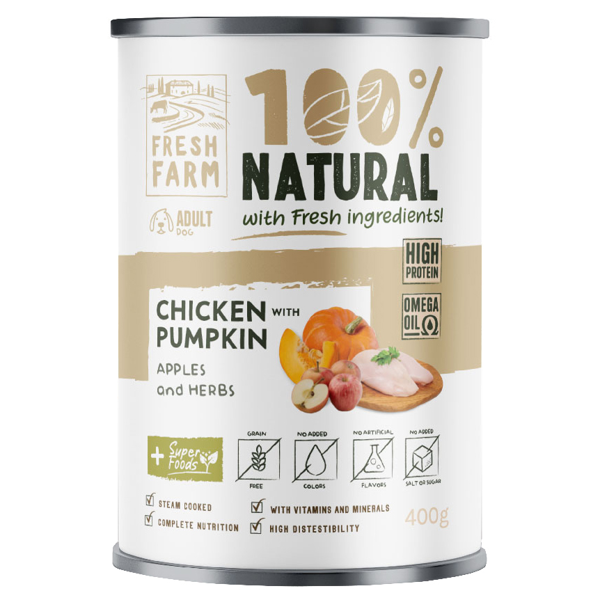 ΚΟΤΟΠΟΥΛΟ, ΚΟΛΟΚΥΘΑ, ΜΗΛΟ & ΒΟΤΑΝΑ: Σύσταση: κοτόπουλο 45%, συκώτι κοτόπουλου 5%, καρδιές κοτόπουλου 5%, κολοκύθα 5%, μήλα 2%, βιταμίνες και μέταλλα, μείγμα βοτάνων, έλαιο σολομού, λιναρόσπορος, φύκη. Πρόσθετα/kg: βιταμίνη D3 (E671) 200 IU, βιταμίνη E (3a370) 150mg, ψευδάργυρος (3b610) 15mg, μαγγάνιο (3b510) 3mg, ανθρακικό ασβέστιο 2mg. Αναλυτικά συστατικά: ακατέργαστη πρωτεΐνη 8%, έλαια και λίπη 6,5%, ακατέργαστη τέφρα 2,5%, υγρασία 75,0%, ακατέργαστες ίνες 0,7%, ασβέστιο 0,3%, φώσφορος 0,2%, νάτριο 0,4%.