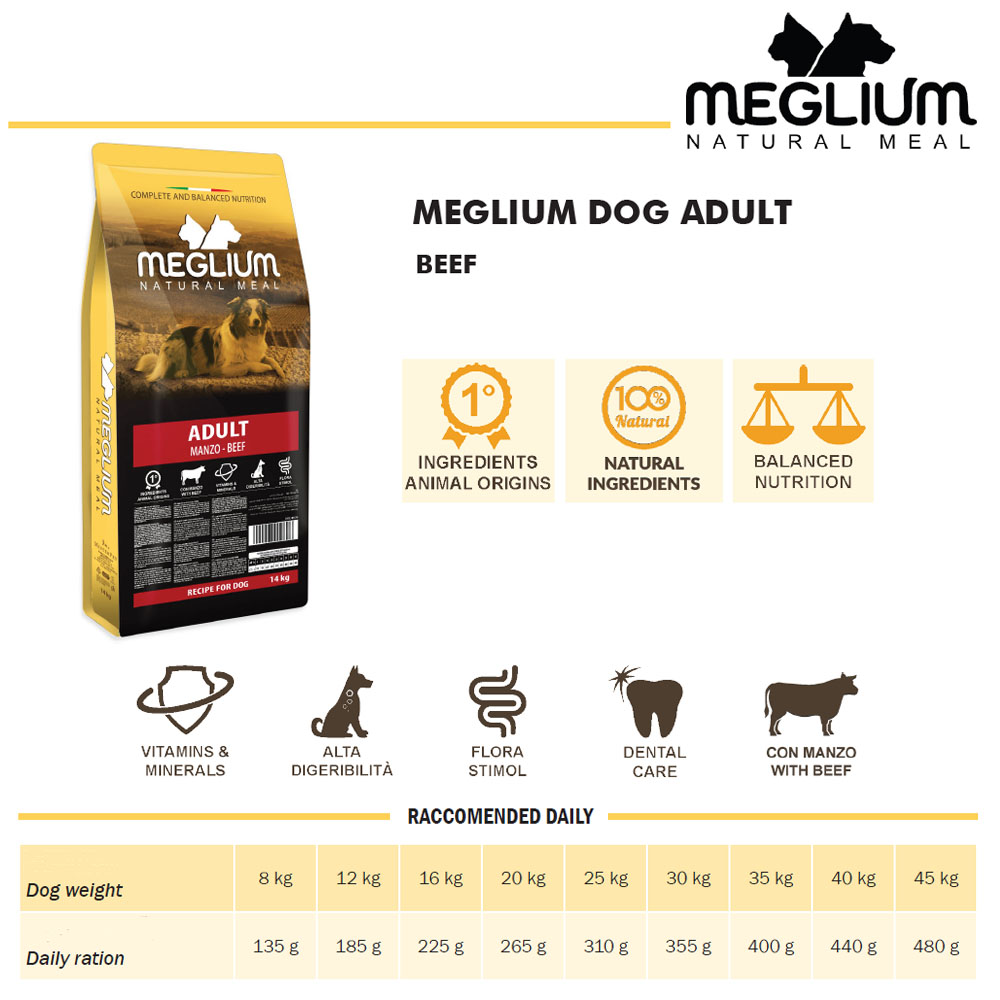 Η Meglium Adult είναι μία πλήρης και νόστιμη τροφή. Περιέχει βοδινό κρέας ως πηγή πρωτεϊνών και πολτό τεύτλων ως πηγή ινών, βιταμινών και μετάλλων. Συστατικά, που την καθιστούν συνιστώμενη τροφή για όλες τις ανάγκες των ενήλικων σκύλων.