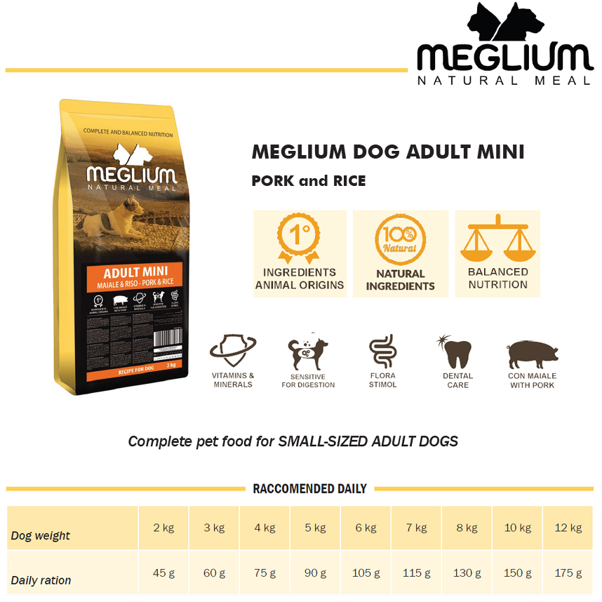 Η Meglium Adult Mini είναι μία πλήρης και νόστιμη τροφή. Περιέχει χοιρινό ως πηγή πρωτεϊνών και πολτό τεύτλων ως πηγή ινών, βιταμινών και μετάλλων. Συστατικά, που την καθιστούν συνιστώμενη τροφή για όλες τις ανάγκες των ενήλικων σκύλων μικρού μεγέθους.