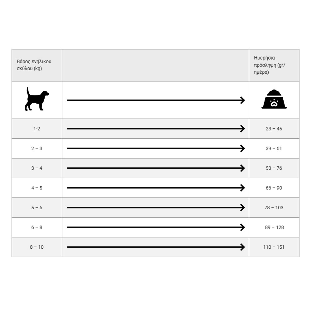 Αναλυτικά συστατικά: Ακατέργαστη πρωτεΐνη – 27%, ακατέργαστες ίνες – 3%, ακατέργαστα λίπη – 17%, ακατέργαστη τέφρα – 8,5%, ασβέστιο - 1,5 %, φώσφορος – 1,2%, κάλιο – 0,6%, νάτριο – 0,5%, Ω-3 λιπαρά οξέα – 0,82%, Ω-6 λιπαρά οξέα - 2,48%.