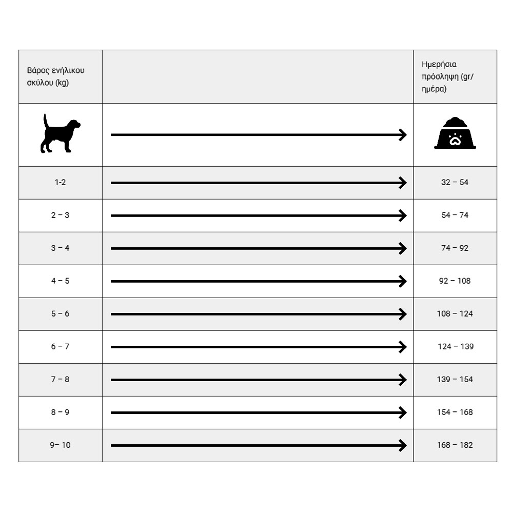 Αναλυτικά συστατικά: ακατέργαστες πρωτεΐνες 24%, ακατέργαστα έλαια και λίπη 13%, ακατέργαστη τέφρα 9,5%, ακατέργαστες ίνες 4%, ασβέστιο 1,2%, φώσφορος 0,9%, κάλιο 0,6%, νάτριο 0,4%, Ωμέγα-3 λιπαρά οξέα 0,64%, Ωμέγα-6 λιπαρά οξέα 2,78%.