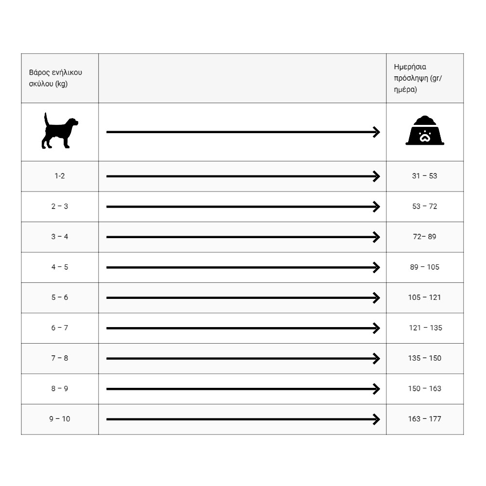 Αναλυτικά συστατικά: ακατέργαστες πρωτεΐνες 25%, ακατέργαστες ίνες 3,5%, ακατέργαστα λίπη 15%, ακατέργαστη τέφρα 9,5%, ασβέστιο 1,5%, φώσφορος 0,9%, κάλιο 0,6%, νάτριο 0,4%, Ωμέγα-3 λιπαρά οξέα 0,50%, Ωμέγα-6 λιπαρά οξέα 2,62%