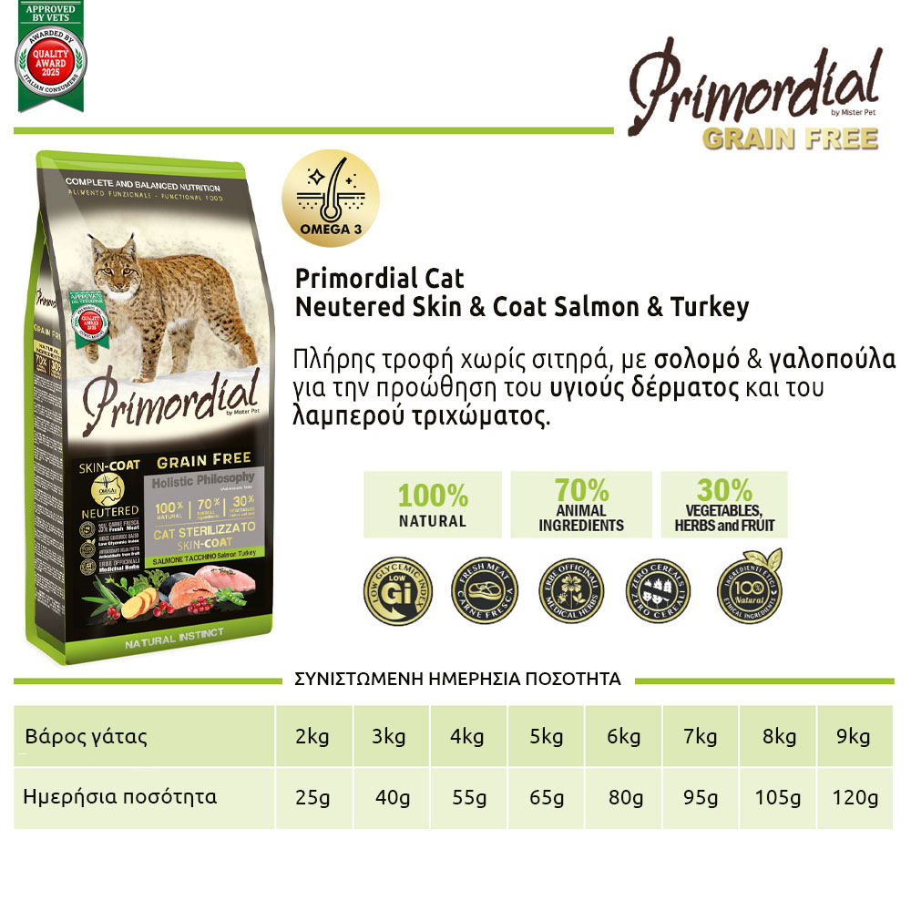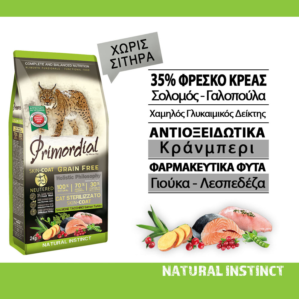 Πλήρης τροφή χωρίς σιτηρά για γάτες, που βοηθά στην προώθηση του υγιούς δέρματος και του λαμπερού τριχώματος.