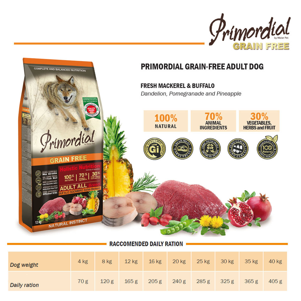 Πλήρης τροφή χωρίς σιτηρά για ενήλικα σκυλιά, εξαιρετικά εύπεπτη, πλούσια σε πρωτεΐνες υψηλής βιολογικής αξίας με χαμηλό αλλεργιογόνο κίνδυνο. Το κρέας βουβαλιού, αυστηρά από ζώα ελευθέρας βοσκής, παρέχει πρωτεΐνες και έχει υπέροχη γεύση που αγαπούν τα σκυλιά. Το σκουμπρί, όπως όλα τα ψάρια, είναι μια πλούσια πηγή λιπαρών οξέων Ωμέγα 3, που επιτελούν μια σημαντική καλλυντική δράση στο δέρμα και στο τρίχωμα και είναι εξαιρετικά ευεργετικά για το καρδιαγγειακό σύστημα. Εμπλουτισμένη με φρούτα και λαχανικά που είναι πλούσια σε βιταμίνες, μέταλλα και θρεπτικά συστατικά. Οι αντιοξειδωτικές ιδιότητες του ροδιού και η επίδρασή της πικραλίδας στην ενίσχυση του ύπατος, δίνουν σε αυτό το γεύμα την τέλεια ισορροπία της γεύσης και των θρεπτικών συστατικών. Ένα πραγματικά ολιστικό προϊόν που συμβάλλει ενεργά στη συνολική υγεία των σκύλων.