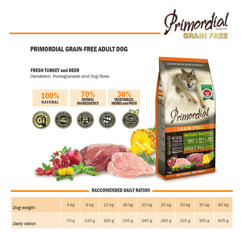 Πλήρης τροφή χωρίς σιτηρά για ενήλικα σκυλιά, εξαιρετικά εύπεπτη, πλούσια σε πρωτεΐνες υψηλής βιολογικής αξίας. Το κρέας ελαφιού, αυστηρά από ζώα ελευθέρας βοσκής, παρέχει πρωτεΐνες με χαμηλό αλλεργιογόνο κίνδυνο και έχει υπέροχη γεύση που αγαπούν τα σκυλιά. Η γαλοπούλα παρέχει εύπεπτες πρωτεΐνες. Εμπλουτισμένη με φρούτα και λαχανικά που είναι πλούσια σε βιταμίνες, μέταλλα και θρεπτικά συστατικά. Οι αντιοξειδωτικές ιδιότητες του ρόδιου και του σκυλοτριαντάφυλλου συμβάλουν στην ενίσχυση του ύπατος. Επίσης, οι σπόροι λιναριού είναι η πλουσιότερη φυσική πηγή σε λιπαρά οξέα Ωμέγα 3, που επιτελούν μια σημαντική καλλυντική δράση στο δέρμα και στο τρίχωμα και είναι ιδιαίτερα ευεργετικά για το καρδιαγγειακό σύστημα. Ένα πραγματικά ολιστικό προϊόν που συμβάλλει ενεργά στη συνολική υγεία των σκύλων.