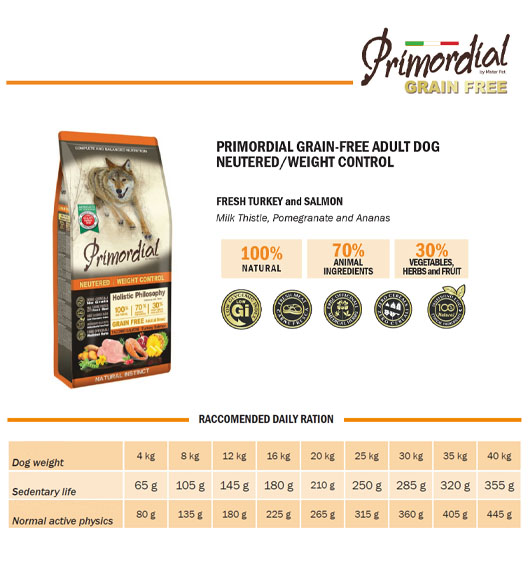 Πλήρης τροφή χωρίς σιτηρά για στειρωμένους ή υπέρβαλους σκύλους, εξαιρετικά εύπεπτη και πλούσια σε πρωτεΐνες υψηλής βιολογικής αξίας. Ο σολομός είναι πλούσιος σε μεταλλικά άλατα και λιπαρά οξέα Ωμέγα 3, τα οποία επιτελούν μια σημαντική καλλυντική δράση στο δέρμα και το τρίχωμα και είναι ιδιαίτερα ευεργετικά για το καρδιαγγειακό σύστημα. Η γαλοπούλα παρέχει εύπεπτες πρωτεΐνες. Εμπλουτισμένη με φρούτα και λαχανικά που είναι πλούσια σε βιταμίνες, μέταλλα και θρεπτικά συστατικά. Οι αντιοξειδωτικές ιδιότητες του ροδιού και η επίδρασή του γαϊδουράγκαθου στο συκώτι δίνουν σε αυτό το γεύμα την τέλεια ισορροπία της γεύσης και των θρεπτικών συστατικών. Ένα πραγματικά ολιστικό προϊόν που συμβάλλει ενεργά στη συνολική υγεία των σκύλων.