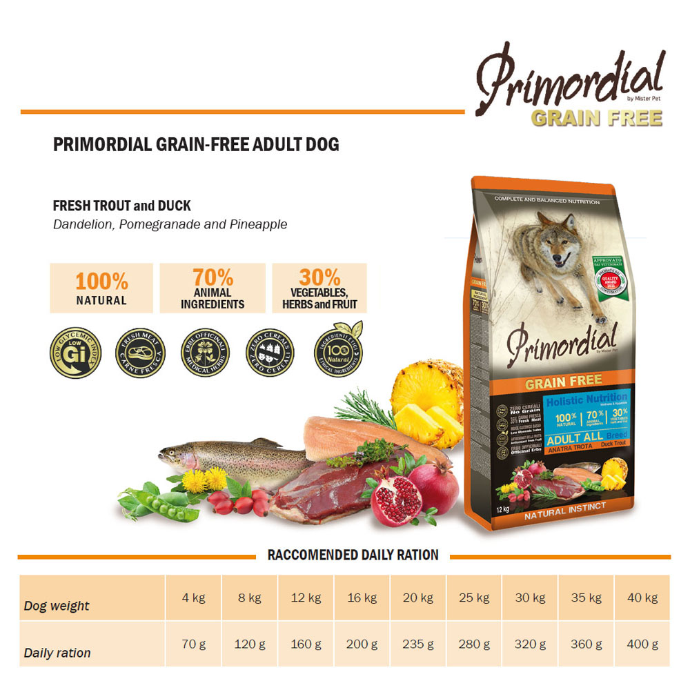 Πλήρης τροφή χωρίς σιτηρά για ενήλικα σκυλιά, πλούσια σε πρωτεΐνες υψηλής βιολογικής αξίας. Το κρέας πάπιας, αυστηρά από ζώα ελευθέρας βοσκής, παρέχει πρωτεΐνες και έχει υπέροχη γεύση που αγαπούν τα σκυλιά. Η πέστροφα, ένα ψάρι που ζει μόνο σε καθαρά νερά, παρέχει εύπεπτες πρωτεΐνες και είναι πλούσια σε λιπαρά οξέα Ωμέγα 3, τα οποία επιτελούν μια σημαντική καλλυντική δράση στο δέρμα και το τρίχωμα και είναι ιδιαίτερα ευεργετικά για το καρδιαγγειακό σύστημα. Εμπλουτισμένη με φρούτα και λαχανικά που είναι πλούσια σε βιταμίνες, μέταλλα και θρεπτικά συστατικά. Οι αντιοξειδωτικές ιδιότητες του ροδιού και η επίδρασή του γαϊδουράγκαθου στο συκώτι δίνουν σε αυτό το γεύμα την τέλεια ισορροπία της γεύσης και των θρεπτικών συστατικών. Ένα πραγματικά ολιστικό προϊόν που συμβάλλει ενεργά στη συνολική υγεία των σκύλων.
