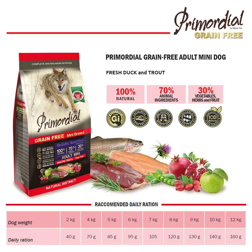 Πλήρης τροφή χωρίς σιτηρά για ενήλικα σκυλιά μικρού μεγέθους, πλούσια σε πρωτεΐνες υψηλής βιολογικής αξίας. Το κρέας πάπιας, αυστηρά από ζώα ελευθέρας βοσκής, παρέχει πρωτεΐνες και έχει υπέροχη γεύση που αγαπούν τα σκυλιά. Η πέστροφα, ένα ψάρι που ζει μόνο σε καθαρά νερά, παρέχει εύπεπτες πρωτεΐνες και είναι πλούσια σε λιπαρά οξέα Ωμέγα 3, τα οποία επιτελούν μια σημαντική καλλυντική δράση στο δέρμα και το τρίχωμα και είναι ιδιαίτερα ευεργετικά για το καρδιαγγειακό σύστημα. Εμπλουτισμένη με φρούτα και λαχανικά που είναι πλούσια σε βιταμίνες, μέταλλα και θρεπτικά συστατικά. Οι αντιοξειδωτικές ιδιότητες του ροδιού και η επίδρασή του γαϊδουράγκαθου στο συκώτι δίνουν σε αυτό το γεύμα την τέλεια ισορροπία της γεύσης και των θρεπτικών συστατικών. Ένα πραγματικά ολιστικό προϊόν που συμβάλλει ενεργά στη συνολική υγεία των σκύλων.