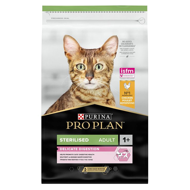 Η Pro Plan Sterilized Sensitive Digestion είναι μια πλήρης και ισορροπημένη ξηρή τροφή για γάτες επιστημονικά σχεδιασμένη για τις ανάγκες των στειρωμένων ενήλικων γατών ηλικίας άνω του 1 έτους. Περιέχει ένα μείγμα θρεπτικών συστατικών που έχει αποδειχθεί ότι συμβάλλει στην προαγωγή της πεπτικής υγείας χάρη στα φυσικά πρεβιοτικά. Με το κοτόπουλο ως Νο. 1 συστατικό, τα υψηλά επίπεδα πρωτεΐνης (41%) και τα ισορροπημένα επίπεδα λίπους, αυτή η εξαιρετική γευστική συνταγή είναι ειδικά σχεδιασμένη για να βοηθά τη γάτα σας να διατηρεί ένα υγιές σωματικό βάρος, υγιή νεφρά και να διατηρεί την υγεία του ουροποιητικού της ενώ ζει την κάθε της στιγμή στο έπακρο.