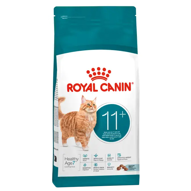 Σχεδιασμένη για - και δοκιμασμένη με - ηλικιωμένες γάτες, η ROYAL CANIN® Ageing 11+ διαθέτει εύκολες στην κατανάλωση κροκέτες για να προσφέρει στη γάτα σας μια ευχάριστη εμπειρία σίτισης. Αυτή η φόρμουλα, με το σύμπλεγμα HealthyAge7™, παρέχει ένα ακριβές θρεπτικό μείγμα σχεδιασμένο για να βοηθά στη διατήρηση επτά βασικών διαστάσεων υγείας και ζωντάνιας στις ηλικιωμένες γάτες: Όρεξη και βάρος: Εξαιρετικά εύγευστη και πλούσια σε ενέργεια για να υποστηρίζει μια υγιή όρεξη και να βοηθά στη διατήρηση ενός ιδανικού βάρους. Πέψη: Περιέχει πρεβιοτικές ίνες και πρωτεΐνες υψηλής εύπεπτης ποιότητας για να υποστηρίζει την υγιή πέψη. Κινητικότητα: Περιέχει EPA & DHA και χονδροϊτίνη για την υποστήριξη της υγείας και της κινητικότητας των αρθρώσεων. Δέρμα και τρίχωμα: Η συμπερίληψη λινολεϊκού οξέος και ψευδαργύρου βοηθά στη διατήρηση της υγείας του δέρματος και του τριχώματος. Νεφρά: Περιέχει πρωτεΐνη υψηλής ποιότητας και προσαρμοσμένα επίπεδα φωσφόρου για την υποστήριξη της υγείας των νεφρών. Εγκέφαλος και όραση: Περιέχει τρυπτοφάνη, EPA & DHA, ταυρίνη και βιταμίνη Α για την υποστήριξη της γνωστικής λειτουργίας και της όρασης. Ανοσία: Περιέχει βιταμίνες C & E, λουτεΐνη, ταυρίνη, βήτα-καροτίνη και λυκοπένιο για την υποστήριξη του ανοσοποιητικού συστήματος. Η ROYAL CANIN® Ageing 11+ διατίθεται σε ποικιλία υφών, όπως κομμάτια σε σάλτσα, κομμάτια σε ζελέ και μαλακή μους.