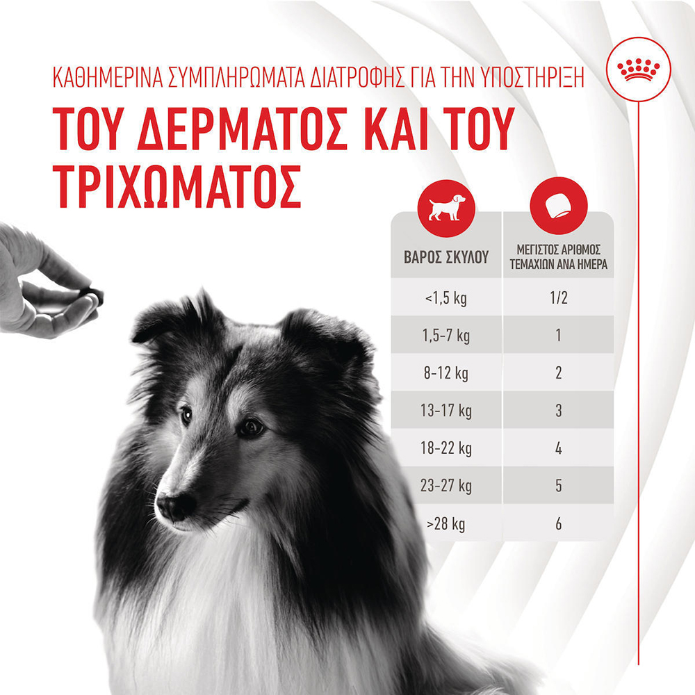Κατάλληλα για ενήλικους σκύλους, τα μασώμενα συμπληρώματα Skin & Coat Adult της ROYAL CANIN® σχεδιάζονται από κτηνιάτρους και εγκρίνονται από τους ίδιους τους σκύλους. Αυτά τα συμπληρώματα είναι ειδικά σχεδιασμένα με ένα επιστημονικά μελετημένο μείγμα συστατικών, που βασίζεται σε περισσότερα από 50 χρόνια έρευνας και παρατήρησης στη διατροφή των σκύλων.
