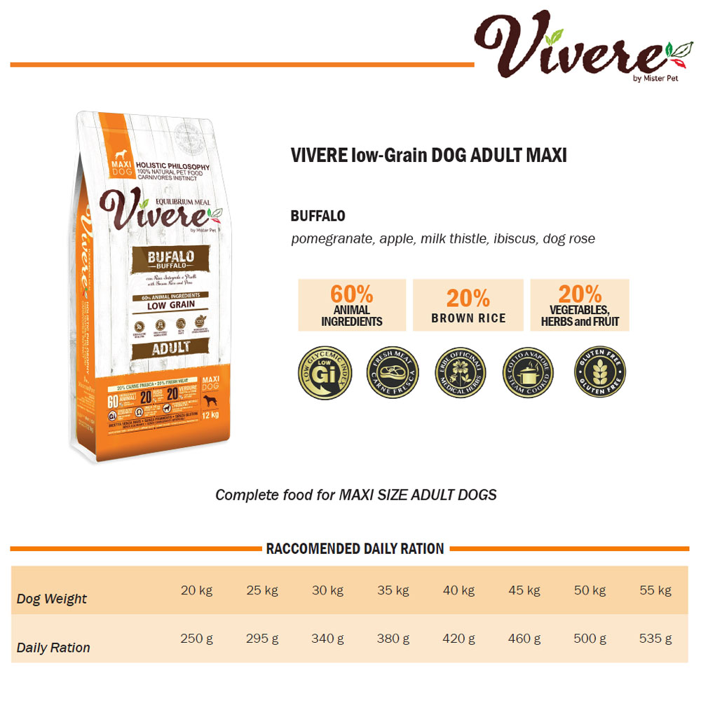 Η σειρά τροφών Vivere περιέχει λειτουργικά συστατικά που βοηθούν στη γενική ευημερία του σκύλου. Φαρμακευτικά βότανα, των οποίων τα εκχυλίσματα και οι δραστικές ουσίες βοηθούν στην σωστή λειτουργία συγκεκριμένων οργάνων. Ωμέγα-3, τα οποία επιτελούν μια σημαντική καλλυντική δράση στο δέρμα και το τρίχωμα και είναι ιδιαίτερα ευεργετικά για το καρδιαγγειακό σύστημα. Φρούτα, πλούσια σε βιταμίνες και ανόργανα άλατα, ως πηγή φυσικών αντιοξειδωτικών. Πρεβιοτικά, που βοηθούν στη διαμόρφωση της εντερικής χλωρίδας. Όλες οι συνταγές Vivere, παρασκευάζονται χωρίς γλουτένη και χωρίς συστατικά που μπορεί να περιέχουν γενετικά τροποποιημένους οργανισμούς.
