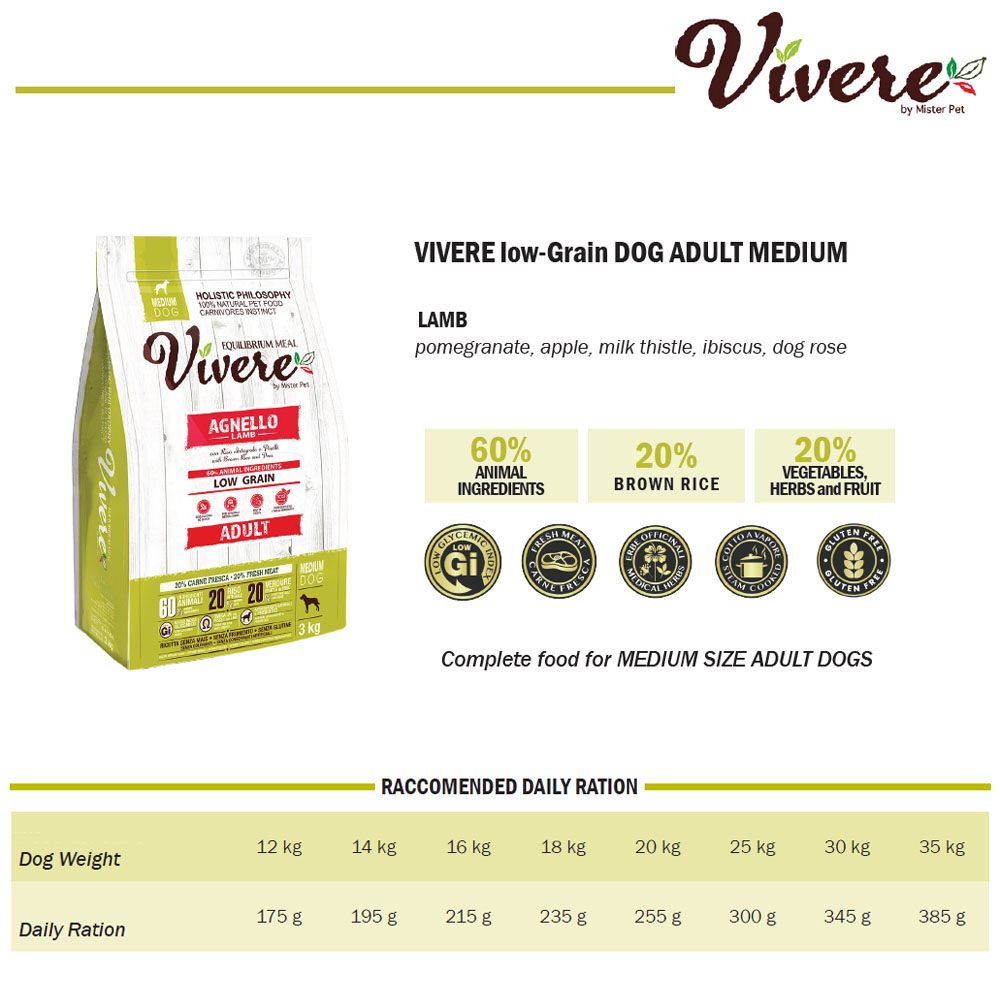 Η σειρά τροφών Vivere περιέχει λειτουργικά συστατικά που βοηθούν στη γενική ευημερία του σκύλου. Φαρμακευτικά βότανα, των οποίων τα εκχυλίσματα και οι δραστικές ουσίες βοηθούν στην σωστή λειτουργία συγκεκριμένων οργάνων. Ωμέγα-3, τα οποία επιτελούν μια σημαντική καλλυντική δράση στο δέρμα και το τρίχωμα και είναι ιδιαίτερα ευεργετικά για το καρδιαγγειακό σύστημα. Φρούτα, πλούσια σε βιταμίνες και ανόργανα άλατα, ως πηγή φυσικών αντιοξειδωτικών. Πρεβιοτικά, που βοηθούν στη διαμόρφωση της εντερικής χλωρίδας. Όλες οι συνταγές Vivere, παρασκευάζονται χωρίς γλουτένη και χωρίς συστατικά που μπορεί να περιέχουν γενετικά τροποποιημένους οργανισμούς.