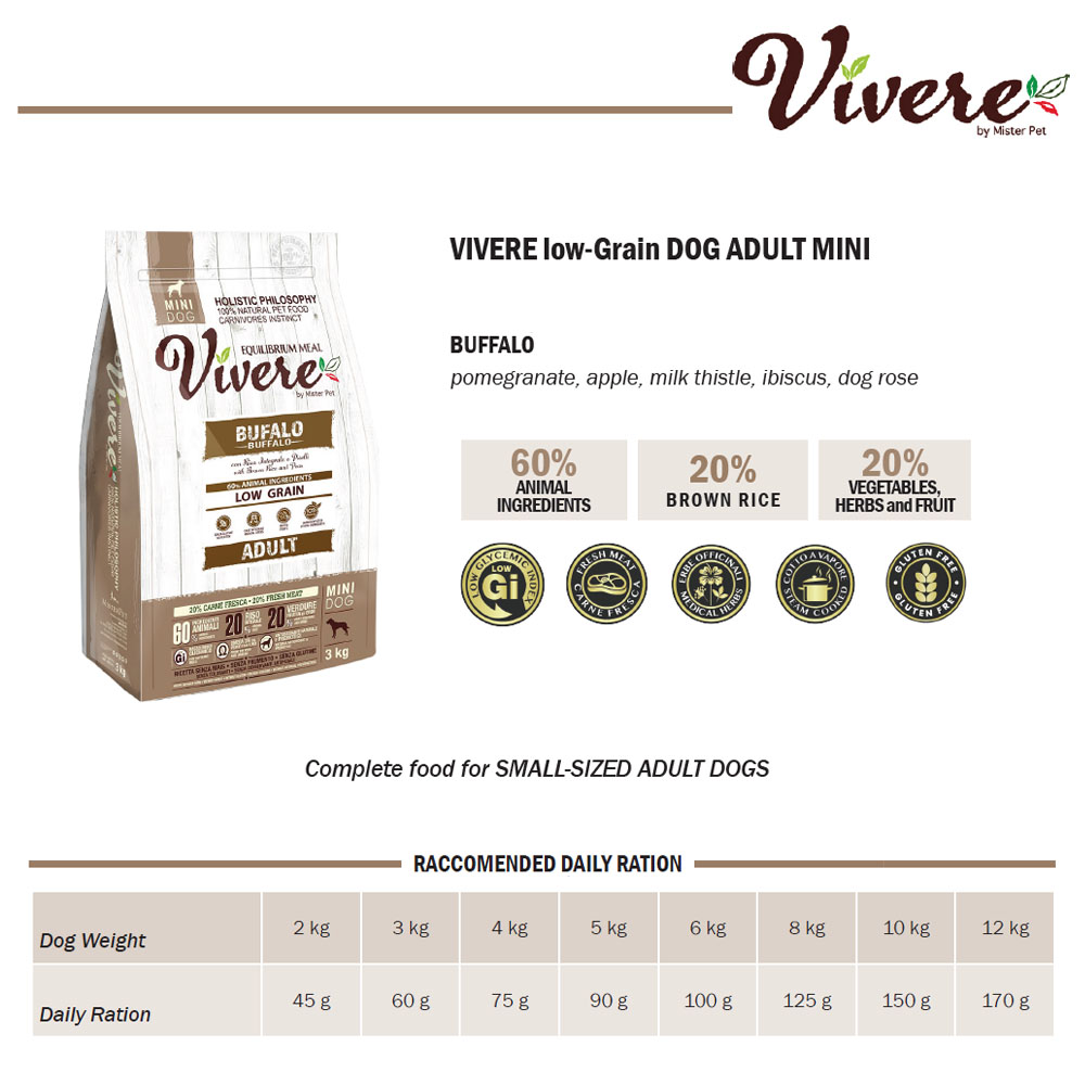 Η σειρά τροφών Vivere περιέχει λειτουργικά συστατικά που βοηθούν στη γενική ευημερία του σκύλου. Φαρμακευτικά βότανα, των οποίων τα εκχυλίσματα και οι δραστικές ουσίες βοηθούν στην σωστή λειτουργία συγκεκριμένων οργάνων. Ωμέγα-3, τα οποία επιτελούν μια σημαντική καλλυντική δράση στο δέρμα και το τρίχωμα και είναι ιδιαίτερα ευεργετικά για το καρδιαγγειακό σύστημα. Φρούτα, πλούσια σε βιταμίνες και ανόργανα άλατα, ως πηγή φυσικών αντιοξειδωτικών. Πρεβιοτικά, που βοηθούν στη διαμόρφωση της εντερικής χλωρίδας. Όλες οι συνταγές Vivere, παρασκευάζονται χωρίς γλουτένη και χωρίς συστατικά που μπορεί να περιέχουν γενετικά τροποποιημένους οργανισμούς.