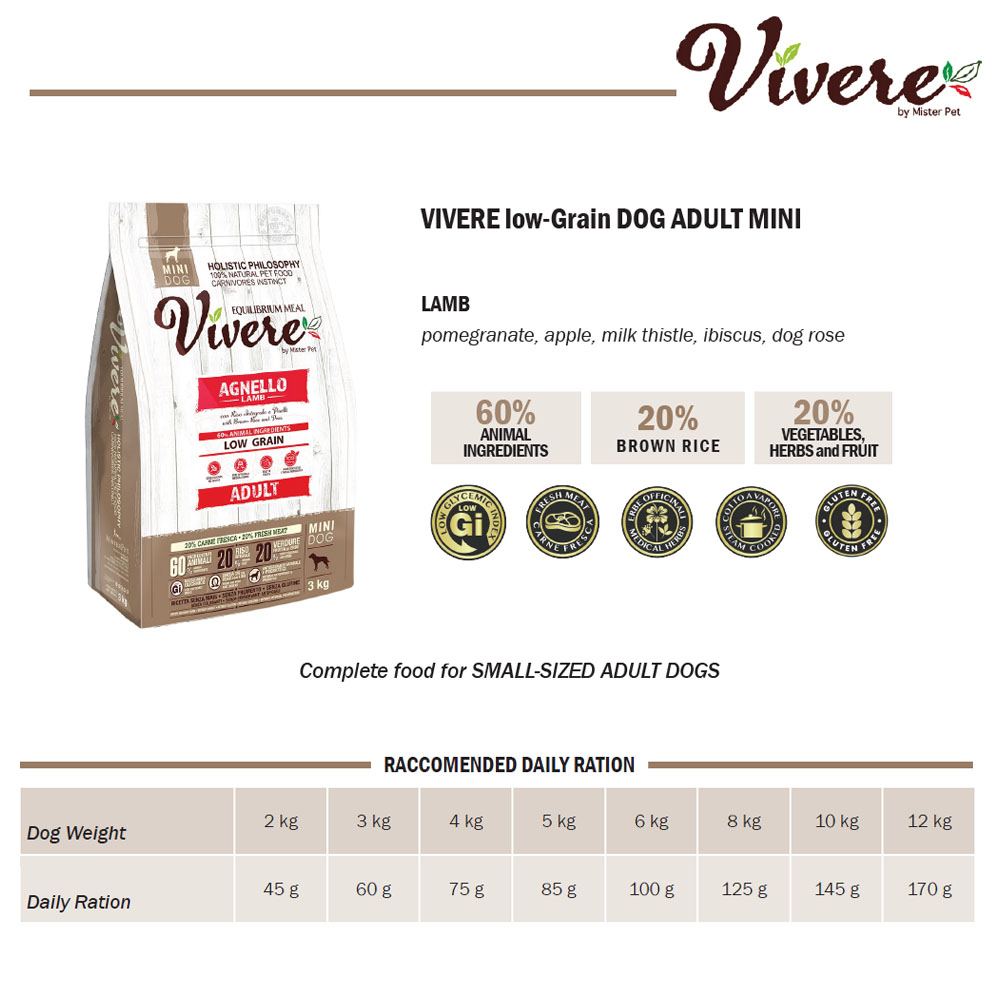 Η σειρά τροφών Vivere περιέχει λειτουργικά συστατικά που βοηθούν στη γενική ευημερία του σκύλου. Φαρμακευτικά βότανα, των οποίων τα εκχυλίσματα και οι δραστικές ουσίες βοηθούν στην σωστή λειτουργία συγκεκριμένων οργάνων. Ωμέγα-3, τα οποία επιτελούν μια σημαντική καλλυντική δράση στο δέρμα και το τρίχωμα και είναι ιδιαίτερα ευεργετικά για το καρδιαγγειακό σύστημα. Φρούτα, πλούσια σε βιταμίνες και ανόργανα άλατα, ως πηγή φυσικών αντιοξειδωτικών. Πρεβιοτικά, που βοηθούν στη διαμόρφωση της εντερικής χλωρίδας. Όλες οι συνταγές Vivere, παρασκευάζονται χωρίς γλουτένη και χωρίς συστατικά που μπορεί να περιέχουν γενετικά τροποποιημένους οργανισμούς.