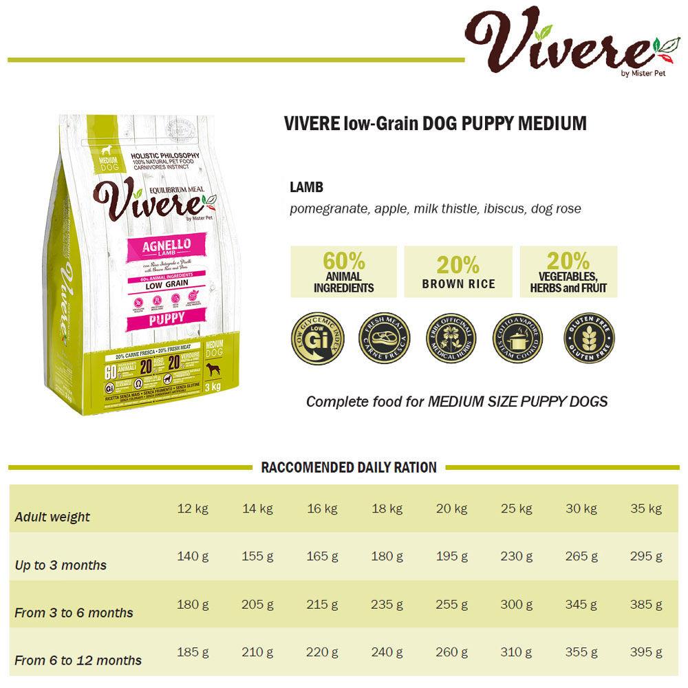 Η σειρά τροφών Vivere περιέχει λειτουργικά συστατικά που βοηθούν στη γενική ευημερία του σκύλου. Φαρμακευτικά βότανα, των οποίων τα εκχυλίσματα και οι δραστικές ουσίες βοηθούν στην σωστή λειτουργία συγκεκριμένων οργάνων. Ωμέγα-3, τα οποία επιτελούν μια σημαντική καλλυντική δράση στο δέρμα και το τρίχωμα και είναι ιδιαίτερα ευεργετικά για το καρδιαγγειακό σύστημα. Φρούτα, πλούσια σε βιταμίνες και ανόργανα άλατα, ως πηγή φυσικών αντιοξειδωτικών. Πρεβιοτικά, που βοηθούν στη διαμόρφωση της εντερικής χλωρίδας. Όλες οι συνταγές Vivere, παρασκευάζονται χωρίς γλουτένη και χωρίς συστατικά που μπορεί να περιέχουν γενετικά τροποποιημένους οργανισμούς.