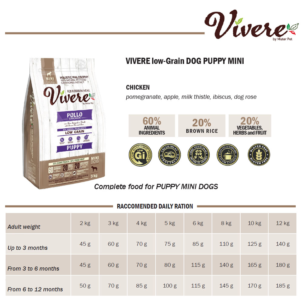 Η σειρά τροφών Vivere περιέχει λειτουργικά συστατικά που βοηθούν στη γενική ευημερία του σκύλου. Φαρμακευτικά βότανα, των οποίων τα εκχυλίσματα και οι δραστικές ουσίες βοηθούν στην σωστή λειτουργία συγκεκριμένων οργάνων. Ωμέγα-3, τα οποία επιτελούν μια σημαντική καλλυντική δράση στο δέρμα και το τρίχωμα και είναι ιδιαίτερα ευεργετικά για το καρδιαγγειακό σύστημα. Φρούτα, πλούσια σε βιταμίνες και ανόργανα άλατα, ως πηγή φυσικών αντιοξειδωτικών. Πρεβιοτικά, που βοηθούν στη διαμόρφωση της εντερικής χλωρίδας. Όλες οι συνταγές Vivere, παρασκευάζονται χωρίς γλουτένη και χωρίς συστατικά που μπορεί να περιέχουν γενετικά τροποποιημένους οργανισμούς.