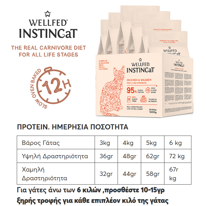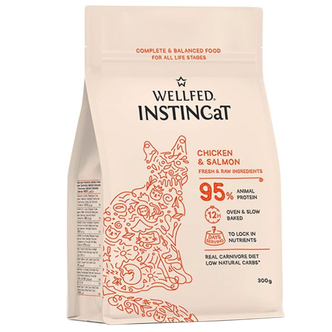 Η INSTINCaT All Life Stages Chicken & Salmon είναι μια πλήρης, φυσικά ισορροπημένη αφυδατωμένη τροφή, σχεδιασμένη για όλα τα στάδια ζωής της γάτας, παρασκευασμένη από φρέσκα συστατικά και ψημένη αργά στον φούρνο (slow oven baked), ώστε να διατηρεί αναλλοίωτη τη γεύση και τη θρεπτική της αξία. Χάρη στη φυσική της σύνθεση, προσφέρει πεπτικότητα που φτάνει έως και το 92%, βοηθώντας την καλύτερη απορρόφηση των θρεπτικών ουσιών και υποστηρίζοντας τη συνολική υγεία της γάτας.